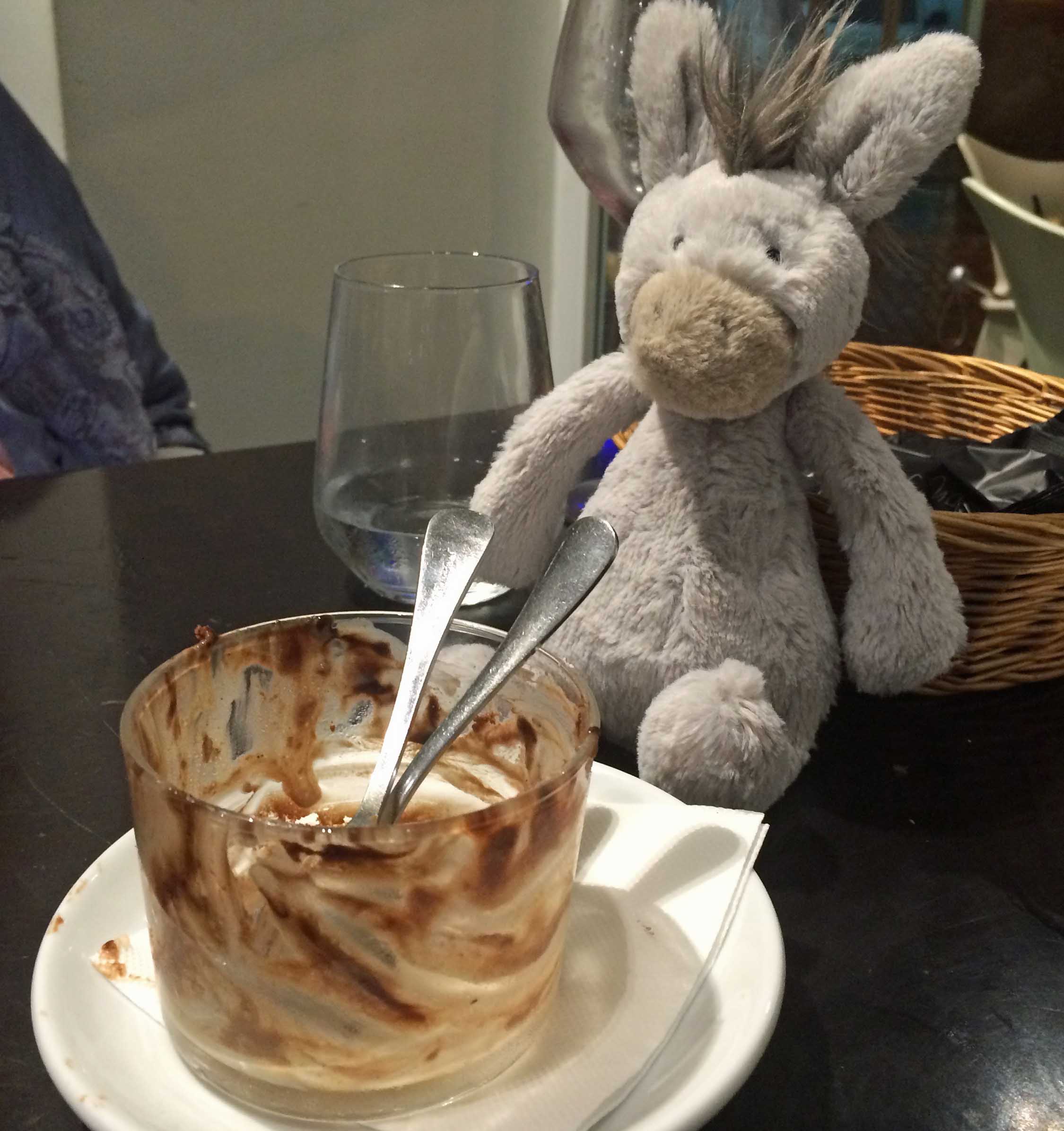 The boar meat was succulent, tender and juicy. Deep red in colour it had a rich taste without being gamey. Most of the ‘wild’ boar one gets in the UK is farmed and as a result is relatively pale and more like pork. Proper wild boar which has been roaming the forests of Spain like this one, is closer to beef and venison. The dish was mane-curlingly good and after three such excellent small dishes DonQui was feeling satisfied but not bloated. He had just enough room to finish things off with a shared chocolate mouse with a gorgeous raspberry concoction underneath.