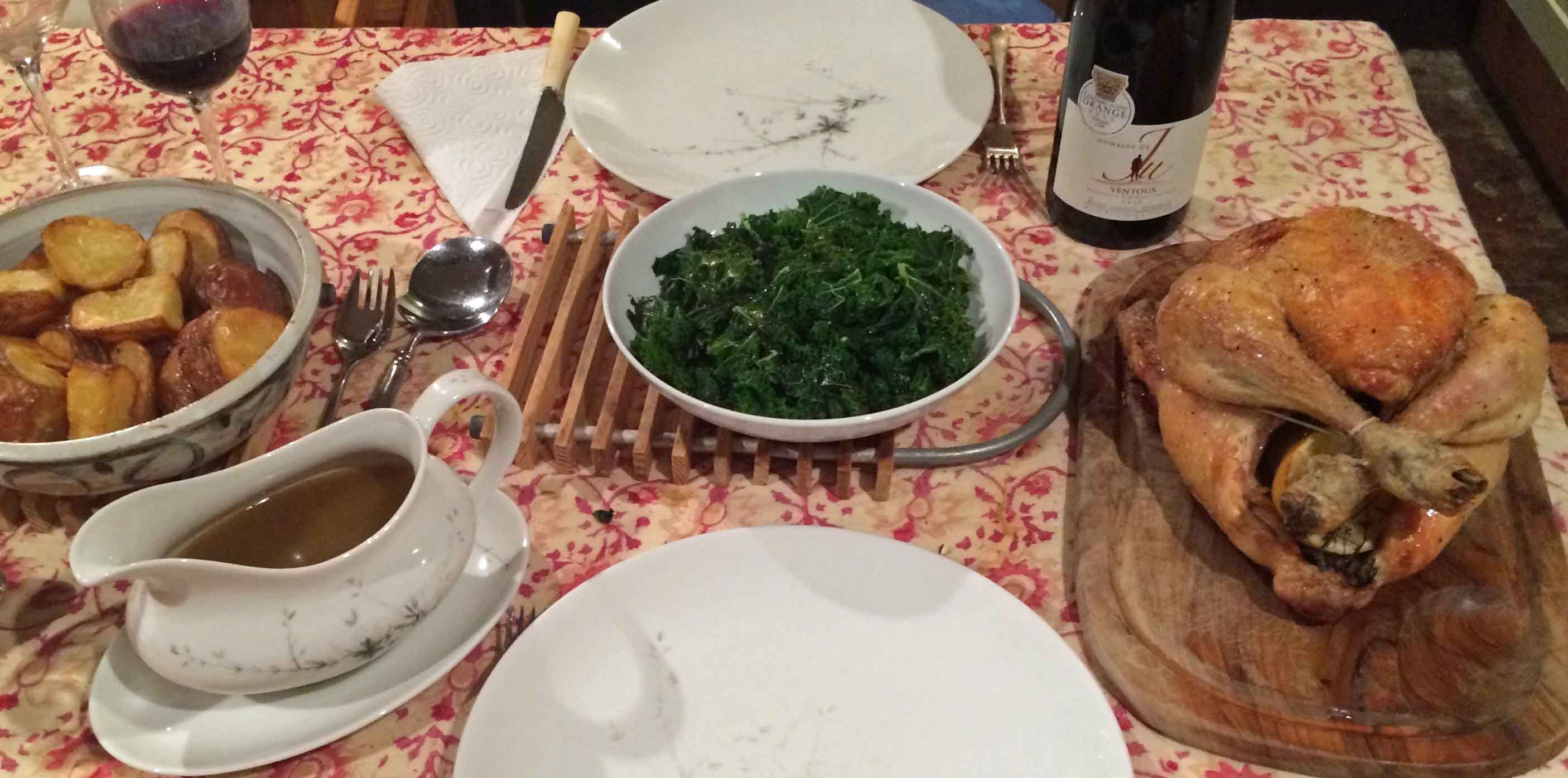 With the chicken resting, the potatoes done and the gravy simmering it is time to finish off the kale and carrots. In both cases the method is the same.