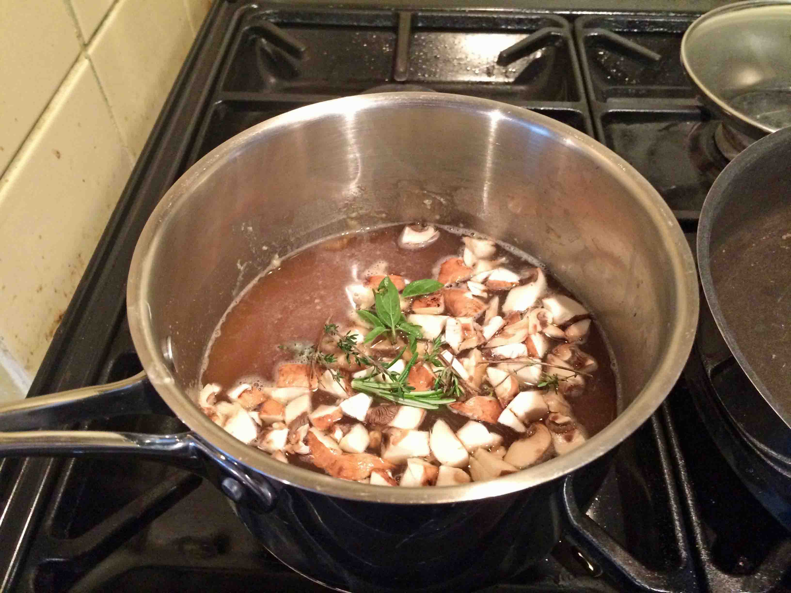 Deglaze the pan with the white wine making sure to scrape up and disolve all the brown bits.