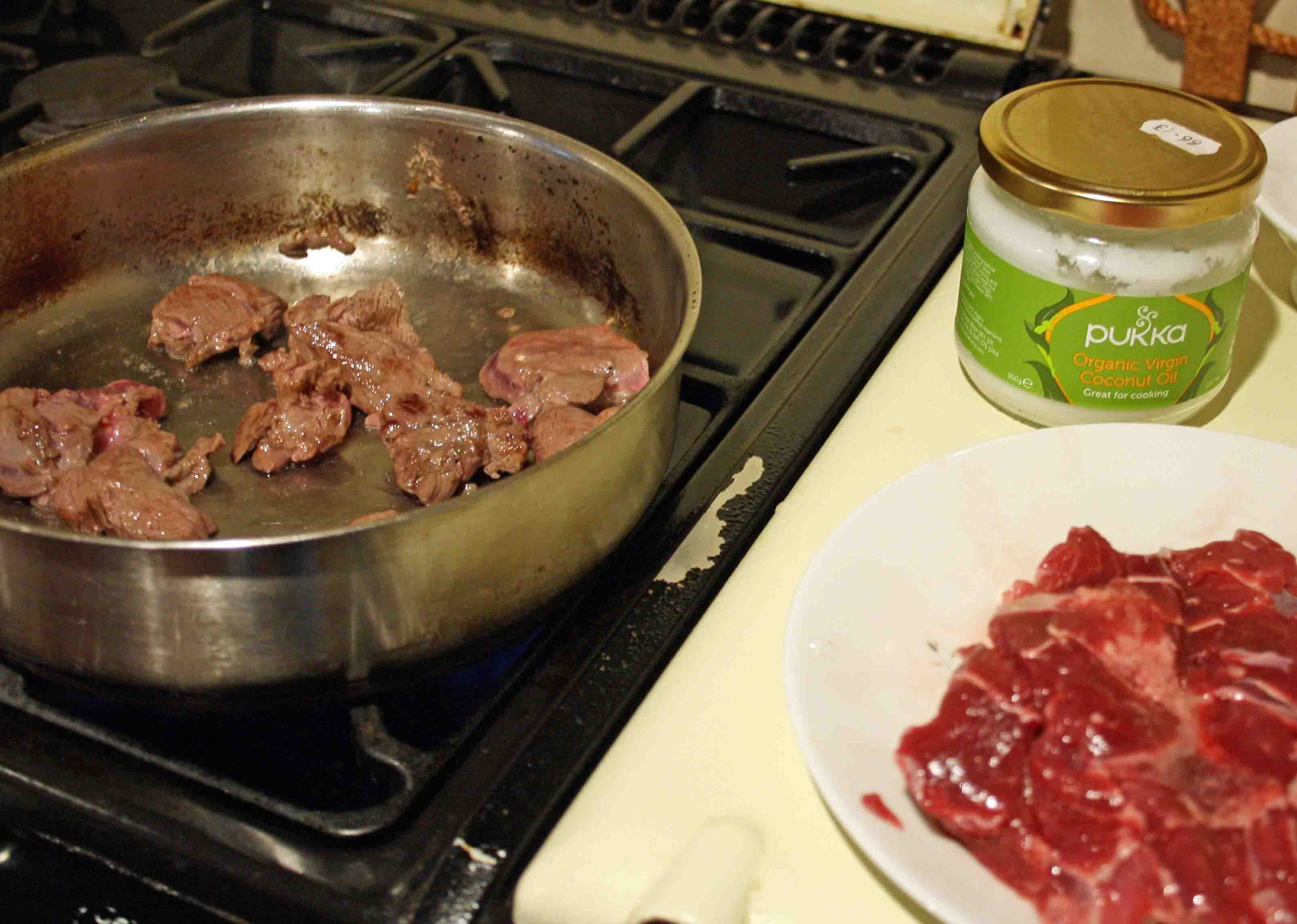 Brown the goat in the coconut oil at high temperature. It is better to do this in small batches so the pan remains hot. Once done set the browned goat to one side.