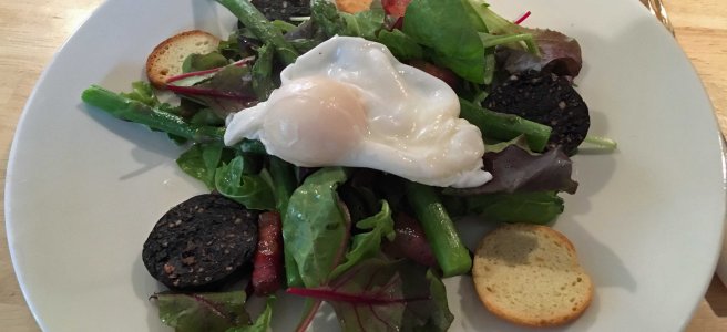 For this delicious summer salad he uses fine slices of smoked duck breast in place of the asparagus, poached egg and black pudding. The dressing is exactly the same but the addition of a handful of chopped toasted walnuts amongst the leaves and a few fresh raspberries around utterly transforms it (not to forget the duck!). It reminds DonQui of the sort of dish he might expect to find in the south of France.