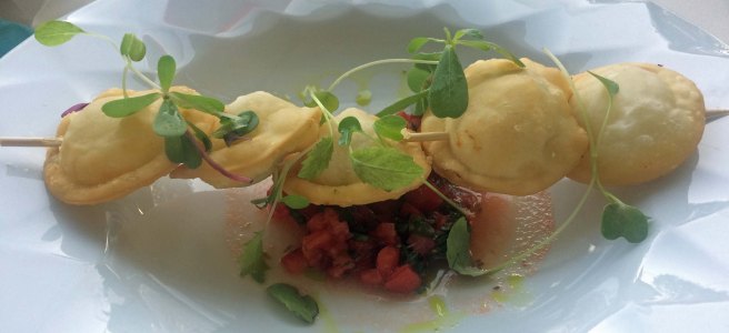 In the end DonQui opts to start with ‘crunchy ravioli’ filled with local cheese and served on a bed of fresh herby tomatoes. The ‘ravioli’ is more like a super light pastry than pasta — hence the ‘crunch’.